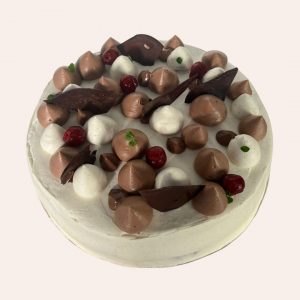 Croustillant praliné cacahuètes, biscuit brownie, mousse vanille, crémeux caramel beurre salé, cacahuètes coulant praliné.